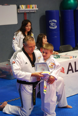 I am a bit late on posting this, but a couple weeks ago Ashton had his first belt test and he PASSED! He went from being a white belt Ninja to a Yellow Belt Ninja. Casey and I were so proud and they had a little belt ceremony for the kids to show off their moves and receive their new belts. Congrats Ashton! We love you and are so proud of you!!